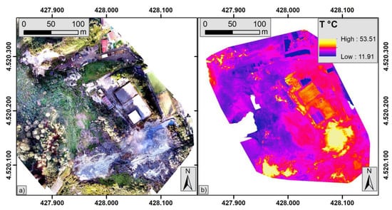 Figure 4 shows a zoom of the area with the biggest thermal anomalies together with a visible mapping. All the thermal maps have been exported from the ArcGis Environment [], selecting only the radiometric component in ASCII GRID format file to improve data readability.