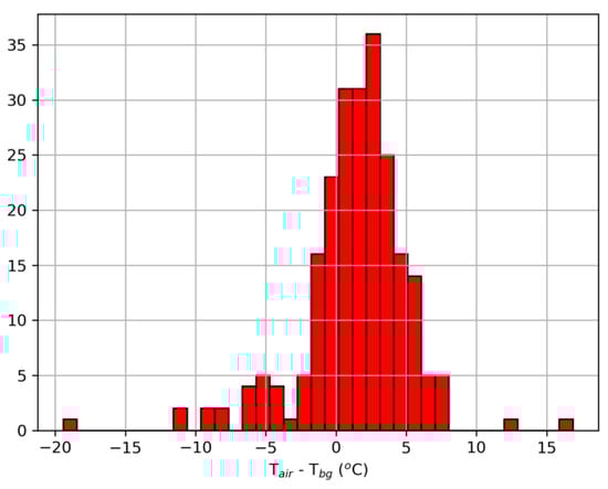 Temperature differences in areas with vegetation are usually due to different emissivity rather than actual temperature difference []. For this reason, the average temperature of the coldest segment was not always the one required as background, as it could include undesired soil features. Hence, it was decided to increase the number of segments every time the average temperature of the cold segment was outside a certain range close to the air temperature. The acceptable range was found from the measurements carried out in Solfatara in Marotta et al., 2019 [], hereby reprocessed in the histogram in Figure 6, where it is noticeable how the difference between air temperature and BG is almost always ≲5 °C. Such temperature was used as the threshold parameter to understand if the cold segment in the image was the right one: in the presence of a bigger difference, the algorithm repeats the segmentation, increasing the number of required segments and uses the next order one (i.e., the second with four segments, the third with five, etc.). This procedure repeats until the selected segment fits into the 5 °C limit.
