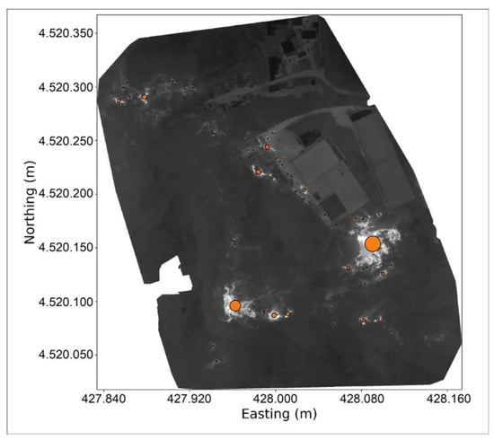 Figure 10a shows the distribution of all clusters in the investigated area using one of the background thermal maps as a basis. It is clearly visible how they tend to thicken over the points with thermal anomalies. It was straightforward to apply the DBSCAN algorithm again in order to identify any coherent zone. The parameters of this second iteration were chosen using the average size and temperature distribution of all the clusters and, again, by using a Euclidean distance in the three-dimensional space of position and temperatures.
