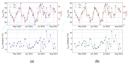 A Principal Component Analysis [] was used to decorrelate average soil temperature from air temperatures; the results are shown in the bottom row of Figure 11. The decorrelated temperatures show a very similar trend in each zone where it was possible to calculate it on most of the flights (“main” zones in Figure 12), and it was possible to identify a change in the shape of the trends that seems to span from the summer of 2021 to the summer of 2023.