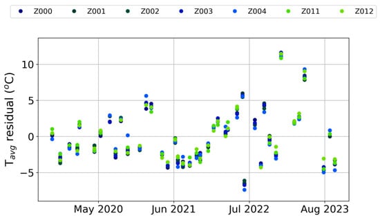 Heat flux trends are shown in Figure 13 for zones Z003 and Z001. Z001 shows a correlation factor between the heat flux and the temperature of 0.84 similar to all the other zones (not reported, but, at average, ≳ 0.8), while Z003 is the only one that shows a much lower factor of 0.49. Zone Z003’s heat flux trend shows a modification in its shape from the summer of 2021 to the summer of 2023 like the decorrelated temperatures (see Figure 12).