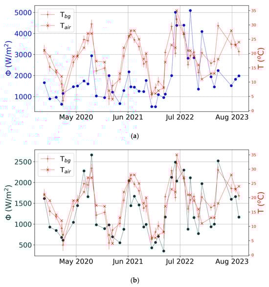 Temporal trends of the heat flux for zones Z003 (a) and Z001 (b). In red, the air and background temperature are shown. When not visible, error bars are smaller than the size of the dots.
