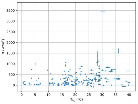 Heat flux in relation to background temperature for the Solfatara data (reprocessed from Marotta et al., 2019 []). Correlation factor is 0.25.