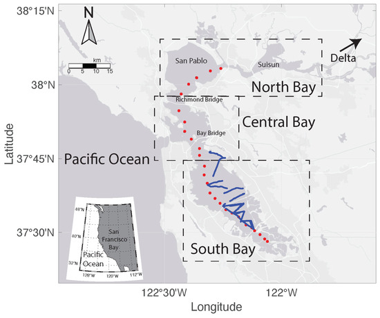 The Bay can be simplified into a series of connected study areas: North Bay, comprising San Pablo and Suisun Bays to the north, Central Bay, which provides direct connection to the Pacific Ocean through the Golden Gate, and South Bay (Figure 1). The Bay is connected to the Sacramento–San Joaquin Delta (Delta) to the northeast, and the Pacific Ocean to the west. North Bay is characterized by a strong salinity gradient, and river water is the primary regulator of bay-wide salinity [1]. North Bay is river-dominated, with salinities ranging from 0 to 15, while South Bay is a marine lagoon, with salinities ranging from 5 to 35. North Bay also tends to have the most riverine-derived suspended sediment.