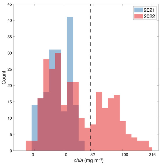 Distribution of field chla data from 2021 and 2022 (plotted on a log10 x-axis). The cutoff of 30 mg m−3 is shown as a vertical dashed line.