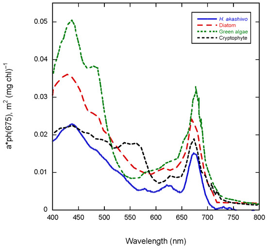 Specific absorption coefficient spectra of cryptophytes (black), diatoms (red), and green algae (green) compared to the raphidophyte H. akashiwo (blue), the species that bloomed in the Bay in 2022. The absorption for H. akashiwo beyond 750 nm was zero or negative, resulting in a discontinuous line.