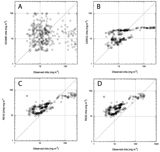 To address these issues for coastal and inland waters, chla algorithms of varying complexity (e.g., [17,19,20,21,22]) have been developed, and several have been proposed specifically for the identification of harmful algal blooms (e.g., [23,24,25,26]). A recent analysis [22] directly compared multiple models grouped loosely into blue-green band ratios, such as the standard OC products from NASA and ESA and Red–Near-Infrared approaches from various authors. That analysis demonstrated that blue-green models perform poorly in turbid (e.g., coastal) waters, while the family of “red-edge” algorithms exhibits similar performance after tuning with in situ matchups.