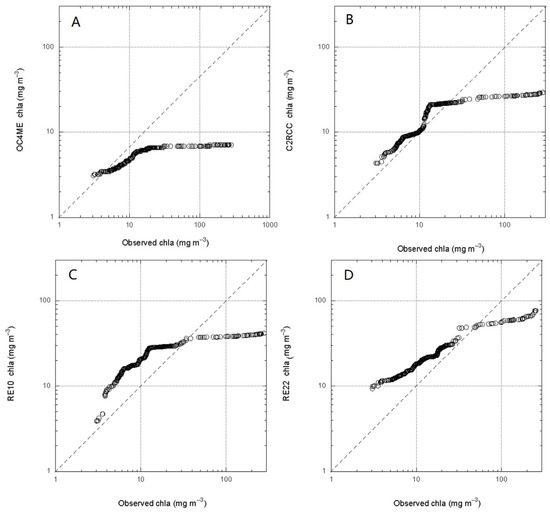 Quantile–quantile plots between field and modeled chla for the standard OC4Me algorithm (A), the C2RCC processor (B), RE10 (C), and RE22 (D). The dashed line indicates the 1:1 fit.