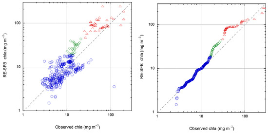 Scatter and quantile–quantile plots between field and modeled chla for the optimized RE-SFB algorithm; symbols represent <28 (blue circles), 28–32 (green diamonds), and >32 (red triangles) values from RE10, used to partition the data, as described in Equation (3). The dashed line indicates the 1:1 fit.