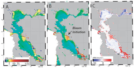 To evaluate whether remote sensing could provide reasonable estimates of chla during extreme events in an operational context, we focus on the H. akashiwo bloom that occurred from about August to September 2022. Satellite data were obtained from the European Space Agency as full-resolution L1A (no atmospheric correction) or L2 (atmospherically corrected, chla-derived) data products and processed in SNAP version 8.0 (see Supplementary Table S1). The ground-based data used for validation and algorithm tuning included data from discrete samples collected at the stations indicated in Figure 1, and high-resolution underway mapping data from the U.S. Geological Survey (USGS) collected for June, August, and September 2021, and July, August, and September 2022 [30,31].
