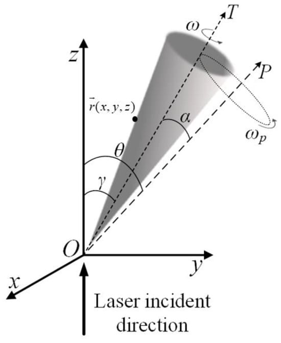 The convex quadric body of revolution, illuminated by one laser plane wave of wavelength whose incidence direction is the z-direction, spins around its central axis with angular velocity while rotating around the precession axis with angular velocity (see Figure 1). The precession angle represents the angle between and . The angle between the line of sight (LOS) and is . The observation angle is the angle between the LOS and . The axis and are both on the plane.