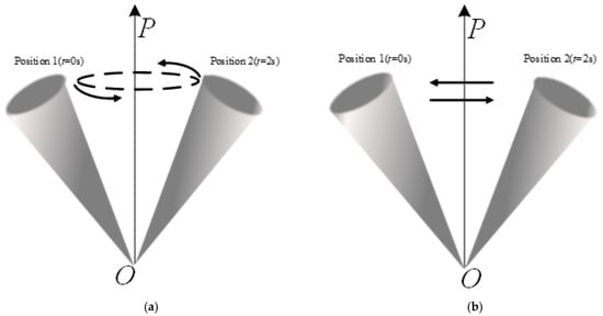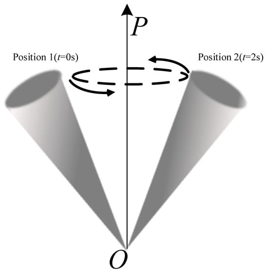 Swing and precession are common forms of micro-motion for spatial targets, characterized by periodic changes in the observation angle; however, their paths of micro-motion diverge. In order to differentiate the Doppler power spectra for various micro-motion forms, we analyzed the swing cone and compared it with the precession cone in this model. In Figure 10, Figure 10a illustrates the concept of precession, depicted as a cone executing a rotational movement around a central axis. Figure 10b demonstrates the principle of swing, where the cone undergoes motion around its apex, confined to a single plane.
