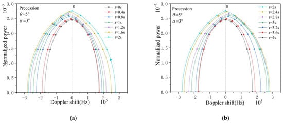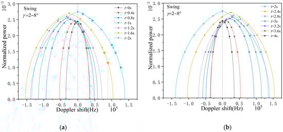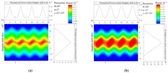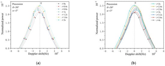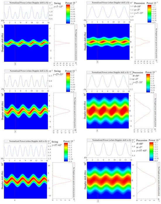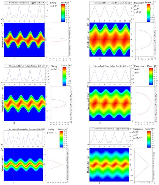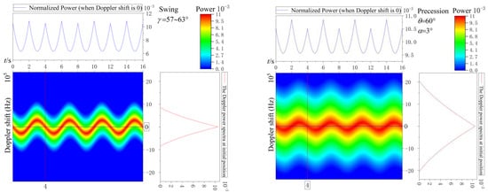 Figure 13 shows the Doppler power spectra from 0 to 16 s in the swing process and precession process with the variation range of increased. For precession and swing, the range of varying from to produces the red curves with increasing width and height. From the blue curves, multiple factors can be observed.