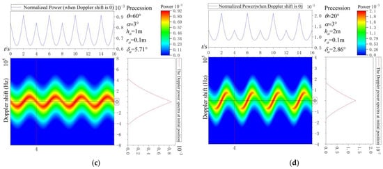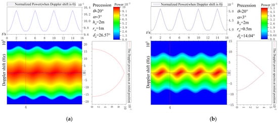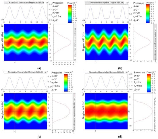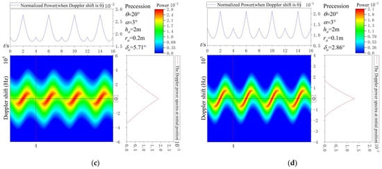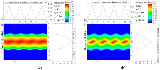 Figure 8 shows the Doppler power spectra from 0 to 16 s in the precession process with different heights of the cone. The blue curve on the top represents the normalized power when the Doppler shift equals 0. The red curve on the right represents the Doppler power spectra of the cone when . We found that the geometric parameters of the cone affect the Doppler power spectra.