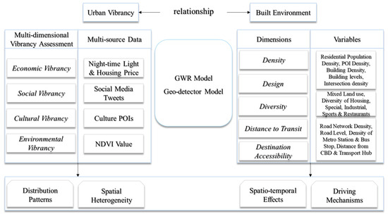 This study explores the relationship between urban vibrancy and the built environment by utilizing multi-source datasets. Four types of assessments are examined, including economic, social, cultural, and environmental vibrancy. Each dimension is measured using specific indicators. The basis and data for the vibrancy dimensions will be introduced in detail in Section 2.2.1, Urban Vibrancy Data. To address the key themes of distribution patterns, spatial heterogeneity, spatiotemporal effects, and driving mechanisms, this study employs GWR and Geodetector models. The findings offer practical insights to urban planners, enabling them to devise and implement strategies more effectively for enhancing urban vibrancy in consideration of local contexts and the high-density built environments of compact cities.