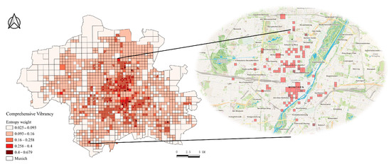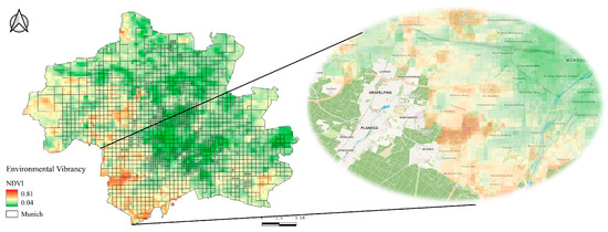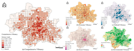 Environmental vibrancy plays a crucial role in shaping urban vibrancy. A high level of environmental quality not only enhances individuals’ inclination to engage in outdoor activities but also attracts more participants in social events [38]. Therefore, the NDVI is employed as an indicator for measuring environmental vibrancy. The remote sensing data are processed with QGIS to extract relevant images based on Munich’s administrative boundaries. The spatial distribution of environmental vibrancy is shown in Figure 3e, with the following formula: