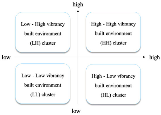The observed values are represented by and , while the spatial weights matrix for spatial units and is denoted as . represents the total number of spatial units. The Global Moran’s I serves as a measure of spatial autocorrelation on a scale ranging between −1 and 1. Positive values indicate a positive spatial correlation, negative values suggest a negative spatial correlation, and values approaching 0 imply a random distribution without any spatial correlation. Significance testing is often conducted using the p-value. To further investigate the relationship between urban vibrancy and the built environment in terms of spatial heterogeneity, this study employs bivariate local spatial autocorrelation analysis through the Local Moran’s I. The formula is as follows: