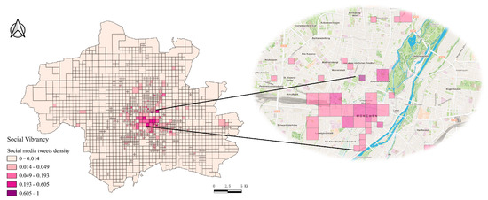 where indicates the social vibrancy of region , represents the total number of tweets in that specific area, and stands for the area of the TAZ. The tweet density portrays social vibrancy by quantifying the concentration of activities from social media users, thereby revealing the liveliness of social interactions within that particular region. A higher tweet density indicates a greater concentration of social media activity, suggesting a more socially vibrant area. Conversely, a lower tweet density implies a less socially active and engaging environment [33]. By employing the tweet density as a proxy for social vibrancy, this study captures the intensity and distribution of social interactions across different areas of the city.