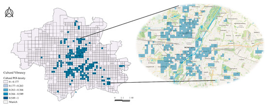 The spatial distribution of cultural vibrancy, as shown in Figure 7, reveals a relatively dispersed pattern, with the highest POI density areas (represented by deep blue) encompassing the city center, extending along the northern S-Bahn line, and stretching southwest along the Isar River. The city center stands out as the most prominent hub for cultural exchange, with institutions such as Haus der Kunst, known for its contemporary art exhibitions and events, reinforcing its central role in the city’s cultural landscape.