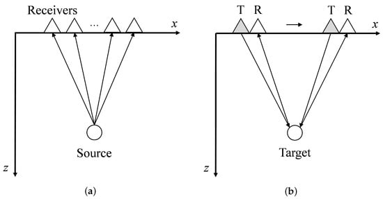 The F-K filtering method was initially employed in the field of seismic exploration to suppress coherent linear events, such as ground roll, guided waves, and side-scattered energy [34]. The schematic diagram illustrating the operational principle of seismic wave exploration is depicted in Figure 1a.
