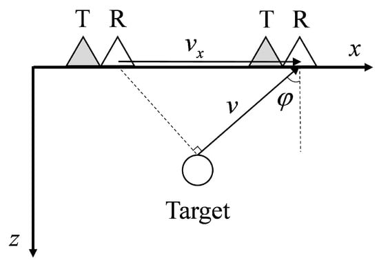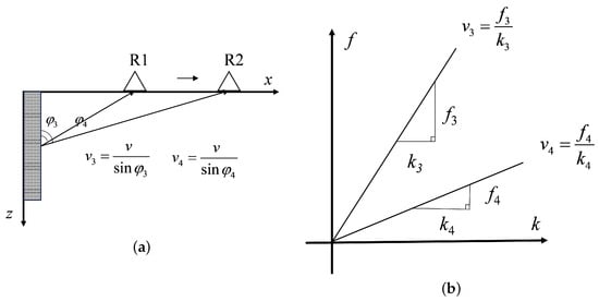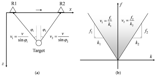 where v represents the propagation speed of electromagnetic waves in the measured medium, while denotes the incident angle of the electromagnetic waves. In addition, within the F-K domain, the apparent velocity can be determined as the slope passing through the origin [36]. Consequently, Figure 3 illustrates a corresponding relationship between target waveform in both time and F-K domains. For simplicity purposes, only receiving antenna R is given.