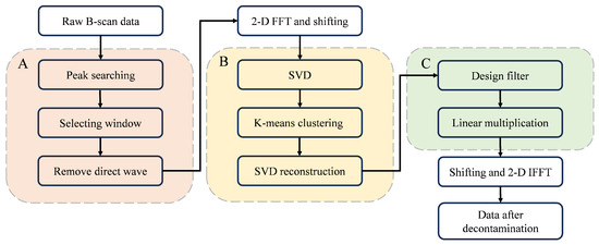 Based on the aforementioned analysis, for effective clutter removal from B-scan data acquired by GPR in complex scenarios, it is imperative to systematically analyze and eliminate various clutter signals individually. This paper presents a robust approach for clutter removal in complex scenarios, as illustrated in Figure 5. The method comprises three primary steps: (A) the peak matching mean subtraction filter for direct coupling removal, (B) a surface jitter interference removal method based on SVD and k-means, and (C) application of an edge Gaussian tapered polar angle filter in the F-K Domain.