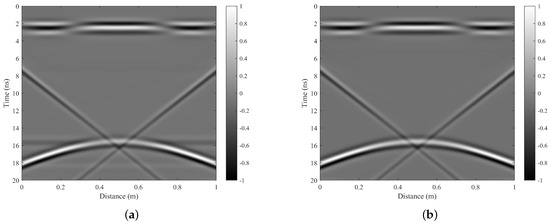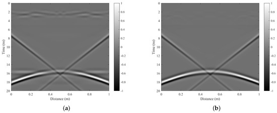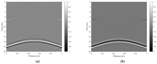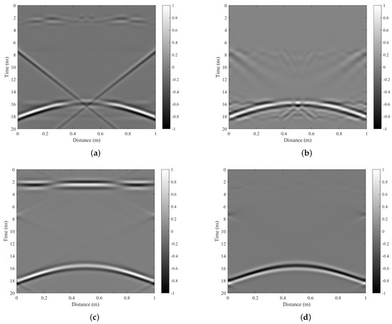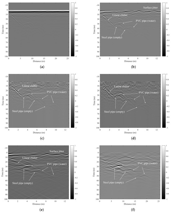 The original B-scan data are presented in Figure 15a. In this figure, a distinct direct coupling surface reflection waveform can be observed at the position of 2 ns, while the target waveform is distributed between 12–16 ns, exhibiting prominent hyperbolic characteristics. Notably, there is significant downward linear interference on the left side and upward linear interference on the right side. These observed data features are entirely consistent with our numerical simulation results.