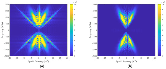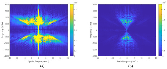 The fundamental principle of the F-K filtering method involves transforming the two-dimensional time-domain B-scan data, as depicted in Equation (1), into the F-K domain using a two-dimensional Fourier transform. By employing tailored filters, it effectively discriminates between clutter and valid signals exhibiting distinct apparent velocities, as illustrated in Equation (2):