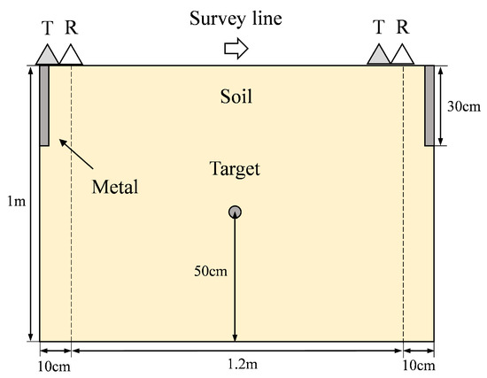 During the experimental test, a measuring line with a length of 1.2 m was employed. Metal plates, measuring 70 cm in length, 2 cm in width, and 30 cm in height, were strategically buried at both ends of the measuring line to induce linear interference waveforms. A metal pipe target with a diameter of 3 cm was positioned at a depth of 50 cm from the central position of the measuring line. The tested medium consisted of volcanic ash exhibiting an approximate relative dielectric constant value of 4. The CAS-1600 GPR operated at a central frequency of 1600 MHz and utilized Ricker wavelet as its excitation waveform. The distance between the transmitting and receiving antennas was approximately maintained at 10 cm.