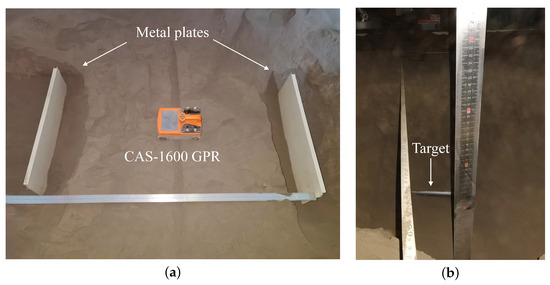 In order to validate the efficacy of our approach in practical scenarios, a series of experiments were conducted at the Aerospace Information Research Institute of the Chinese Academy of Sciences using our self-developed 1600-MHz GPR system CAS-1600. The schematic diagram of the real test scene we designed is shown in Figure 13. The actual test photos are shown in Figure 14.