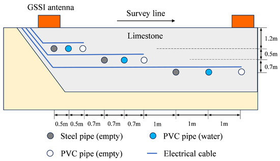 The survey line had a length of 12.85 m, and the surveyed profile exhibited a trapezoidal shape filled with limestone. Within this profile, three layers of pipes were laid, each layer containing three pipes: an empty steel pipe, a PVC pipe filled with water, and another empty PVC pipe. Each individual pipe measured 2.5 m in length, while the burial depth varied across the layers. Additionally, the distance between pipes within the same layer increased with depth. Furthermore, each layer featured a large cross-sectional cable oriented orthogonally to the axis of the pipes. The 270 MHz data from limestone area survey line 2 was measured using a GPR system designed by GSSI (Geophysical Survey Systems, Inc; Nashua, NH, USA). The system was used in bistatic configuration, using a 270 MHz antenna with 200 data samples per metre and a time window of 100 ns, during which 1024 32-bit data points were sampled.