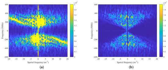 Experimental results in F-K domain: (a) The raw B-scan data. (b) The processed results.