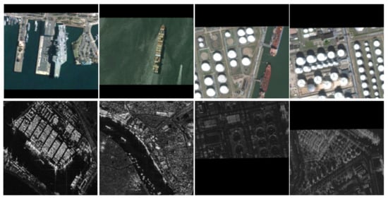 Synthetic aperture radar (SAR) is an advanced active microwave sensor. Its all-weather, all-day operation capabilities and resistance to lighting and climate conditions have led to its widespread application in fields such as geological surveying, disaster relief, climate monitoring, agricultural management, and maritime surveillance []. Under adverse weather conditions, high-resolution SAR images can provide effective detection and monitoring of typical objects such as ships, buildings, aircraft, and oil tanks [,,]. Due to the unique imaging modality of SAR, its imaging results significantly differ from optical remote sensing [], as shown in Figure 1. Compared with the optical images, SAR images have lower signal-to-noise ratios and spatial resolution, and are heavily contaminated with image noise, which leads to difficulty for object detection. In the community of SAR object detection, the approach of utilizing optical images to assist in the interpretation of SAR images has garnered attracted substantial attention.