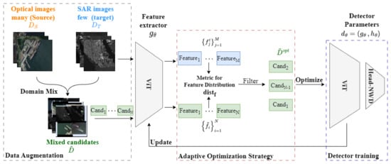 We present the details of a novel semi-supervised cross-domain object detection framework from optical to SAR domain. The proposed method’s overall architecture is shown in Figure 2, and it mainly involves three iterative steps to optimize the detector to transfer knowledge from the fully labeled optical domain to the SAR domain with only few labeled samples. Firstly, to address the issue of insufficient SAR image data in the target domain and align the image-level and instance-level features between the two domains, we construct a new data augmentation method to generate a new domain that is more similar to the distribution of the SAR domain. Secondly, we enhance the acquisition of global features by using ViT for extract features both the expanded hybrid and SAR images. Thirdly, to enhance the effectiveness of data features, we introduce a metric matrix to filter the extracted features. Finally, we input the optimized samples for iterative optimization of the detector, and the IOU of the detector head is replaced with NWD.