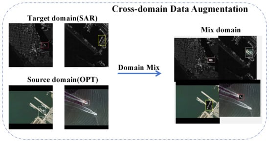 Domain adaptation (DA) emerges as a valuable technique to mitigate the challenge posed by limited annotated samples in the field of object detection []. The fundamental goal of domain adaptation is to train a model on a source dataset and ensure its robust performance on a significantly different target dataset. Typically, the source domain comprises the data distribution used for model training, while the target domain represents the distinct data distribution encountered during testing []. Methods of domain adaptation have been widely applied in cross-domain target detection tasks [,,]. Recently, several studies have employed domain adaptation methods for SAR image object detection. Shi et al. [] extended the pioneering work of domain-adapted object detection by integrating multiple discriminators by Chen et al. []. Pan et al. [] proposed an end-to-end domain-adaptation-based ship detection network consisting of imbalanced discriminant alignment and imbalanced prediction consistency. Xu et al. [] introduced a multilevel alignment network that transfers knowledge from the optical domain to the SAR domain using domain adversarial strategies. However, most current cross-domain methods overlook two issues. The first is the neglect of the supervisory role of few annotated SAR images on the network. In practical applications, there are often few annotated data in the SAR domain (target domain) that can be accessed. The second issue is the focus on feature adversarial alignment while ignoring the fusion alignment on the data across the two domains.