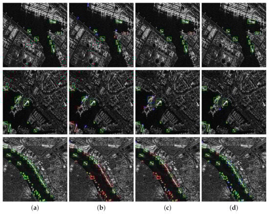 Visualization results of ship detection for three scenes in HRSC → HRSID task. The green rectangle is the correct detection object, the red rectangle is the missed detection object, and the blue rectangle is the false alarm detection object. (a) Ground truth, (b) YOLOv5, (c) SoftTeacher, (d) proposed method.