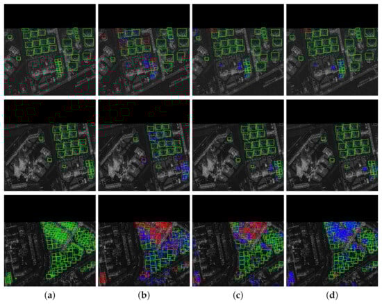 Visualization results of oil tank detection for three scenes in SN6-OPT → SN6-SAR task. The green rectangle is the correct detection object, the red rectangle is the missed detection object, and the blue rectangle is the false alarm detection object. (a) Ground truth, (b) YOLOv5, (c) SoftTeacher, (d) proposed method.