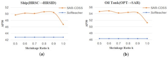 Furthermore, we investigated the impact of the shrinkage rate k in filtering samples during adaptive optimization process on detection performance, where indicates no optimization, as shown in Figure 6. The line graph in the figure suggests that our proposed adaptive optimization method can better assist the model in cross-domain training. Simultaneously, it can be observed that within a certain range of k values, the detection performance of the model remains relatively stable.