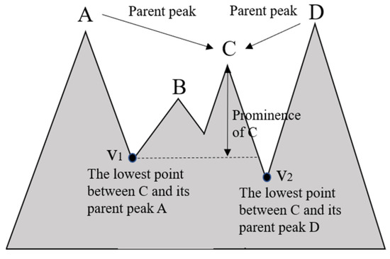The concept of BPV can be applied to any DPC method. It plots DPC scores obtained by (9) for ECA, (14) for E-FDPC, (20) for IaDPA, (24) for k-SNNC, (31) for bc-DPC-BS, and (34) for k-DPC-BS, etc., as a curve where each point on the curve corresponds to the band prominence value (BPV) of one band. For example, for band C, BPV(C) is calculated and illustrated in Figure 1, which shows that the band prominence value of the peak C can be calculated.
