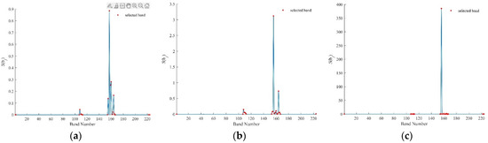 Because and may share the same nearest neighbors, Li et al. [50] proposed an efficient SNN clustering (SNNC) method for hyperspectral optimal BS, which can obtain the local density of each band using SNN to more accurately reflect the local distribution characteristics. In other words, the local density of each band obtained by SNN can more accurately reflect the similarities in the local distribution characteristics, measured by: