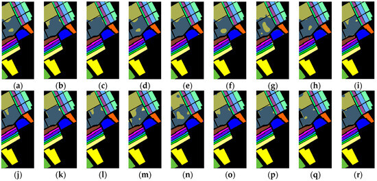 Figure 13a–r shows the classification maps produced by (a) full bands, (b) UBS, (c) bc-BDPC-SID, (d) bc-BDPC-SAM, (e) bc-BDPC-SIDAM, (f) k-BDPC-SID, (g) k-BDPC-SAM, (h) k-BDPC-SIDAM, (i) SMI-BS, (j) ECA, (k) E-FDPC, (l) IaDPI, (m) DPC-KNN (kBS), (n) DPC-KNN (k = 2%L), (o) G-DPC-KNN (kBS), (p) G-DPC-KNN (k = 10), (q) SNNC (kBS), and (r) SNNC (k = 3), respectively. Overall, all the methods performed reasonably well upon visual inspection, except for the classification of the second largest class: class 6 (highlighted in brown), which had subtle differences.