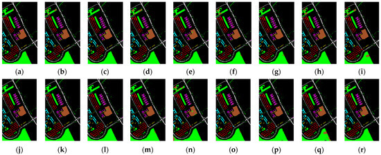 Classification maps produced by IEPF-G-g using different BS criterion for University of Pavia data. (a) Full bands (OA = 98.23%), (b) UBS (OA = 96.87%), (c) bc-BDPC-SID (OA = 97.82%), (d) bc-BDPC-SAM (OA = 97.83%), (e) bc-BDPC-SIDAM (OA = 98.13%), (f) k-BDPC-SID (OA = 89.12%), (g) k -BDPC-SAM (OA = 9707%), (h) k-BDPC-SIDA (OA = 96.63%), (i) SMI-BS (OA = 97.46%), (j) ECA (OA = 95.76%), (k) E-FDPC (OA =97.95%), (l) IaDPI (OA = 97.00%), (m) DPC-KNN (kBS) (OA = 97.79%), (n) DPC-KNN (k = 2%L) (OA = 96.07%), (o) G-DPC-KNN (kBS) (OA = 96.93%), (p) G-DPC-KNN (k = 10) (OA = 96.79%), (q) SNNC (kBS) (OA = 97.39%), (r) SNNC (k = 3) (OA = 96.30%).