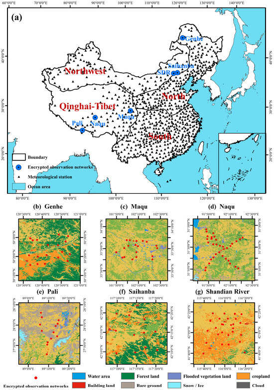 Study area and in situ observations. (a) Spatial distribution of meteorological stations and six dense in situ observation networks in China, with China’s four major geographical regions [59]. (b–g) The dense in situ soil moisture and soil temperature networks.