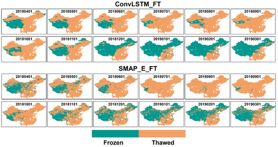 Figure 3 shows the temporal and spatial distribution of CovLSTM_FT over China throughout a whole year on every first day of each month from April 2018 to March 2019, along with the corresponding SMAP_E_FT for comparison. The variation of the frozen ground area shows a good seasonal trend, with the percentage of the frozen ground area decreasing to a minimum in summer (July, August, and September) and then gradually increasing to a maximum in winter (January). Moreover, compared with the slightly fragmented distribution of SMAP_E_FT, ConvLSTM_FT shows reasonably continuous distributions of frozen and thawed ground, which can be attributed to the introduction of ESDR_FT.