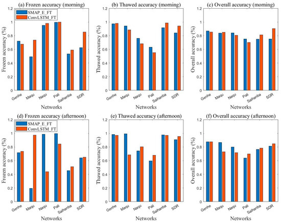Here, the classification accuracy of SMAP_E_FT is also evaluated and compared with ConvLSTM at each dense in situ network to determine ConvLSTM’s superiority. In addition, to further demonstrate the performance of ConvLSTM_FT at different seasons, the classification accuracy of ConvLSTM_FT and SMAP_E_FT is also compared in frozen, freeze-thaw, and thawed seasons. Note that, by integrated analyses on the actual FT characteristics of each month in the six dense in situ networks, December and January are defined as frozen seasons, February, March, April, October, and November as freeze-thaw transitional seasons, and May to September as thawed seasons.