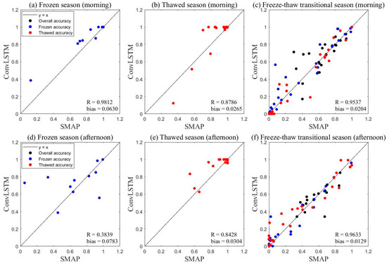 For a more comprehensive comparison of ConvLST_FT with SMAP_E_FT, we take one step further to figure out their classification performances within different seasons, i.e., the frozen, thawed, and freeze-thaw transitional seasons. According to the measurements of the six in situ networks, we divide a year into frozen season (December and January), freeze-thaw transitional season (February, March, April, October, and November), and thawed season (May, June, July, August, and September). Because there is very little thawed soil in a frozen season, comparisons between thawed classification accuracies are not included in Figure 5a,d. It is the same in Figure 5b,d that the frozen classification accuracies are not considered in a thawed season. Overall, the high correlation coefficients R between the two products indicate that ConvLSTM_FT maintains the classification accuracy of SMAP_E_FT, while the positive biases indicate that ConvLSTM_FT has a comparably higher classification accuracy at frozen, thawed, and freeze-thaw transitional seasons than SMAP_E_FT. According to the biases of morning and afternoon products in the three seasons, the superiority of ConvLSTM_FT is most significant in the frozen season, followed by the thawed and freeze-thaw transitional season. It is worth noting that, in the frozen season, the bias of 0.0630 in the morning and 0.0783 in the afternoon implies that the classification accuracy has been increased by about 7.03% relative to SMAP_FT.