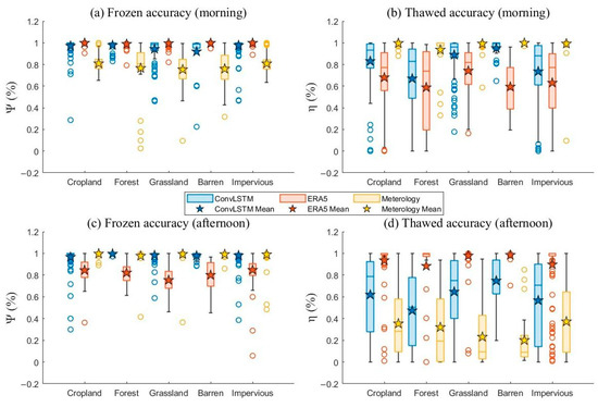 Statistical results of the frozen (a,c) and thawed (b,d) classification accuracies of ConvLSTM_FT, ERA5_FT, and Meteorology_FT on different land cover types in the morning (a,b) and afternoon (c,d). The circles represent outliers.