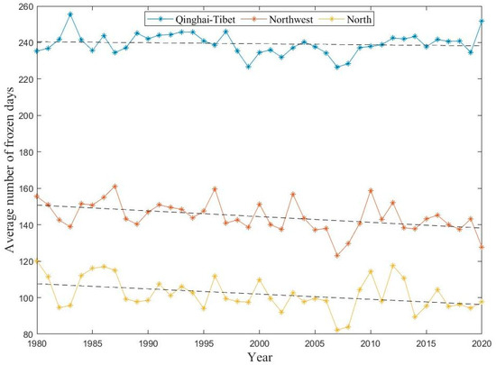 Based on ConvLSTM_FT’s 9 km soil FT products in China from 1980 to 2020, frozen days in those years are counted year by year within China’s four regions: Qinghai–Tibet, northwest, north, and south. Based on the trend analysis method, Figure 11 presents the variation of the average number of frozen days in each region from 1980 to 2020, with the southern region excluded because there are generally only thawed soils all year around in southern China. The results show that, from 1980 to 2020, the number of frozen days in the three regions averaged 168 days, with an average decreasing trend of −0.21 d/a. As expected, the Qinghai–Tibet region owns the longest frozen days, with a mean value of 239 days, followed by the northwestern and northern regions, with a mean value of 144 days and 102 days, respectively. Although all three regions have experienced a decreasing trend in the number of frozen days, they are different from each other. Specifically, as shown in Figure 11 and Table 2, the decreasing rate is the fastest in the northwest, while the average frozen days decreased the slowest in Qinghai–Tibet. The phenomenon may be directly related to the global warming. We know that more areas in the northern and northwestern regions are seasonally frozen ground (SFG) than the Qinghai–Tibet region (with more permafrost areas). Studies have shown that the impact of increasing air temperature on the variations of frozen days will be more direct and significant in SFG than in permafrost [77]. That is probably because SFG is located at the top layer of the ground, while the long-term degradation process of permafrost has a resistant effect to more frequent FT transitions caused by increased temperature [78].