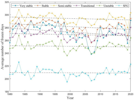 We further analyze and discuss the decreasing rate of frozen days in the past 41 years (1980–2020) within Qinghai–Tibet under the subcategories of permafrost, which is divided by Ran et al. based on the thermal stability of permafrost [67]. The thermal stability of the permafrost is evaluated according to the mean annual ground temperature and ranked from high to low as very stable, stable, semi-stable, transitional, and unstable. It can be observed from Figure 12 that, from 1980 to 2020, the variation trends in the average number of frozen days decreased across all six frozen grounds under different thermal stabilities. The decreasing rate of frozen days gradually slows down as thermal stability decreases, with very stable of −0.31 d/a, stable of −0.22 d/a, semi-stable of −0.11 d/a, transitional of −0.09 d/a, and unstable of −0.05 d/a (Table 2).