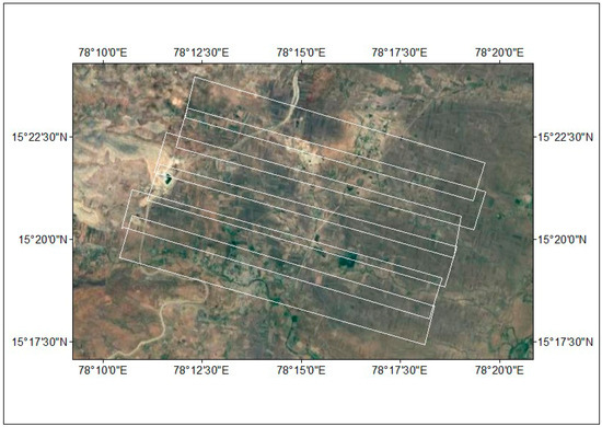 Ground-truth surveying of rice fields was carried out during the fourth week of February 2018 (20–24 February), and the AVIRIS-NG images were acquired on 26 February 2018, which has spectral range of 380–2510 nm with spatial resolution of 4–8 m. The AVIRIS-NG map with six scenes used in the study is depicted in Figure 1. Farmers’ fields were surveyed based on the stratified random sampling procedure. A total of 132 fields in Banaganapalle were selected randomly during the dry season for rice LAI estimation at various phenological phases (15.723°N to 15.979°N latitude; 77.926°E to 78.186°E longitude) (Figure A1 in Appendix A, Figure 2). The dates of sowing and transplanting were recorded through farmer’s interaction and rice growth stages observed at the time of data collection. The plantings varied considerably, and lasted for three months from the second week of November 2017 to first week of February 2018. The harvesting was done for a period of two months, i.e., from the first week of March to the second week of May 2018. Field measurements of in situ LAI was recorded from the surveyed fields individually during or near the AVIRIS-NG airborne data acquisition.